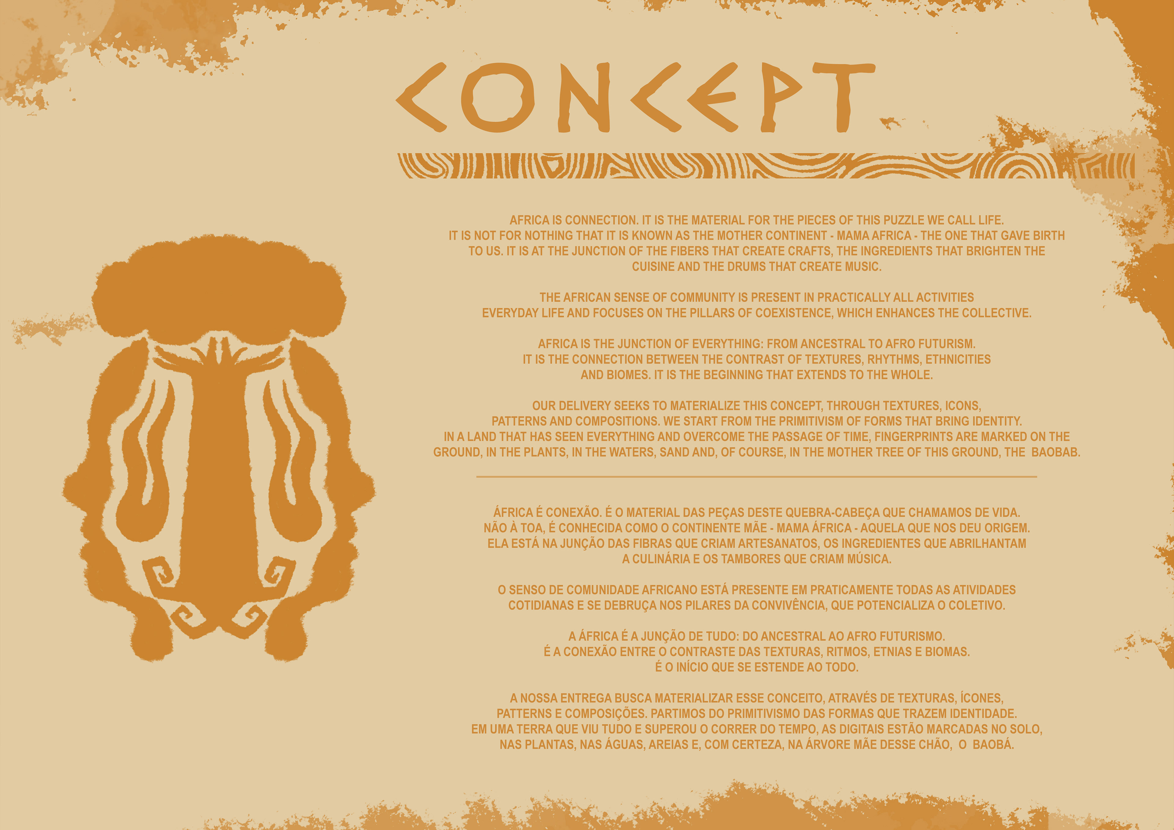 Africa is connection. It is the material for the pieces of this puzzle we call life. It is not for nothing that it is known as the mother continent - Mama Africa - the one that gave birth to us. It is at the junction of the fibers that create crafts, the ingredients that brighten the cuisine and the drums that create music. The African sense of community is present in practically all activities everyday life and focuses on the pillars of coexistence, which enhances the collective. Africa is the junction of everything: from ancestral to Afro futurism. It is the connection between the contrast of textures, rhythms, ethnicities and biomes. It is the beginning that extends to the whole. Our delivery seeks to materialize this concept, through textures, icons, patterns and compositions. We start from the primitivism of forms that bring identity. In a land that has seen everything and overcome the passage of time, fingerprints are marked on the ground, in the plants, in the waters,