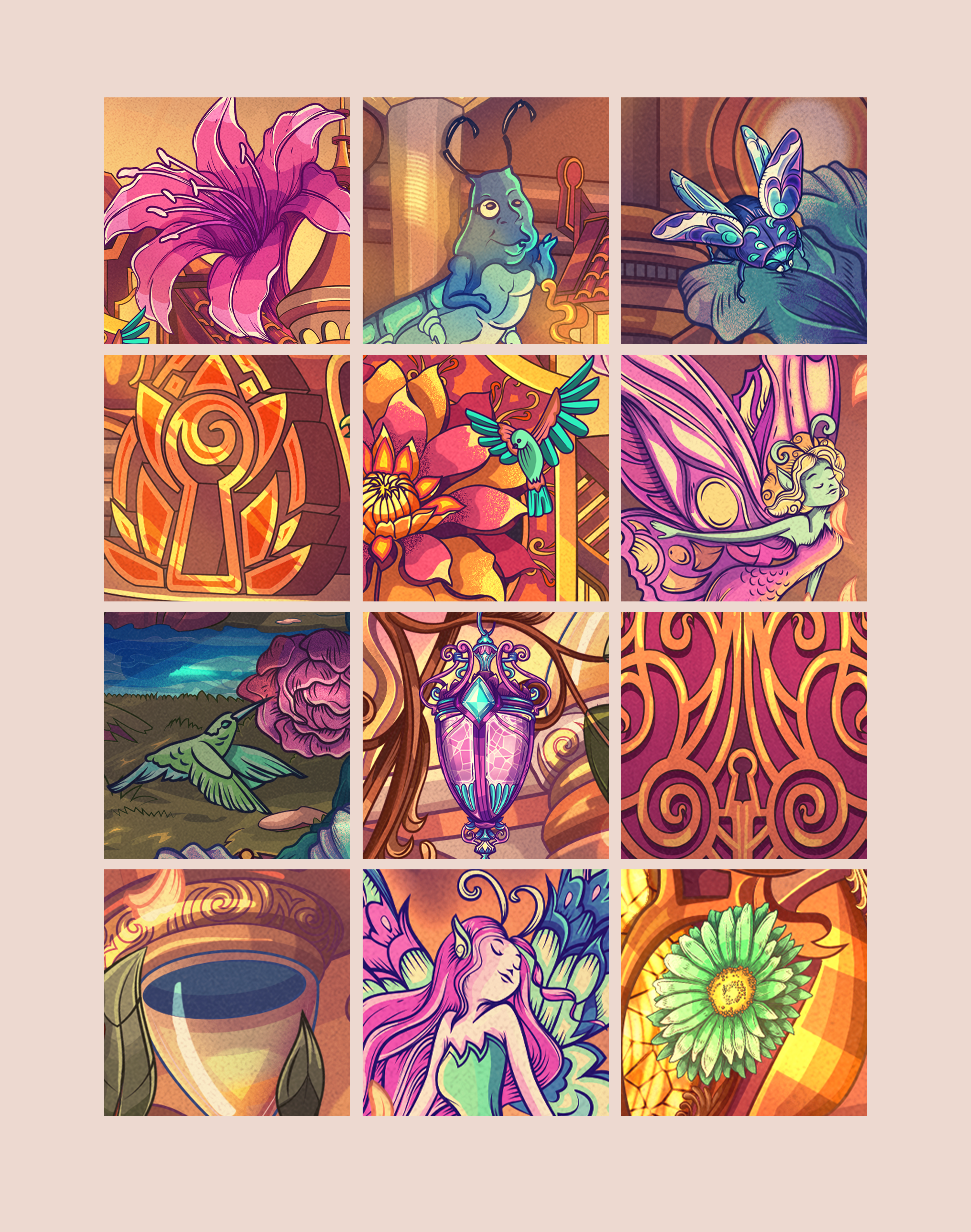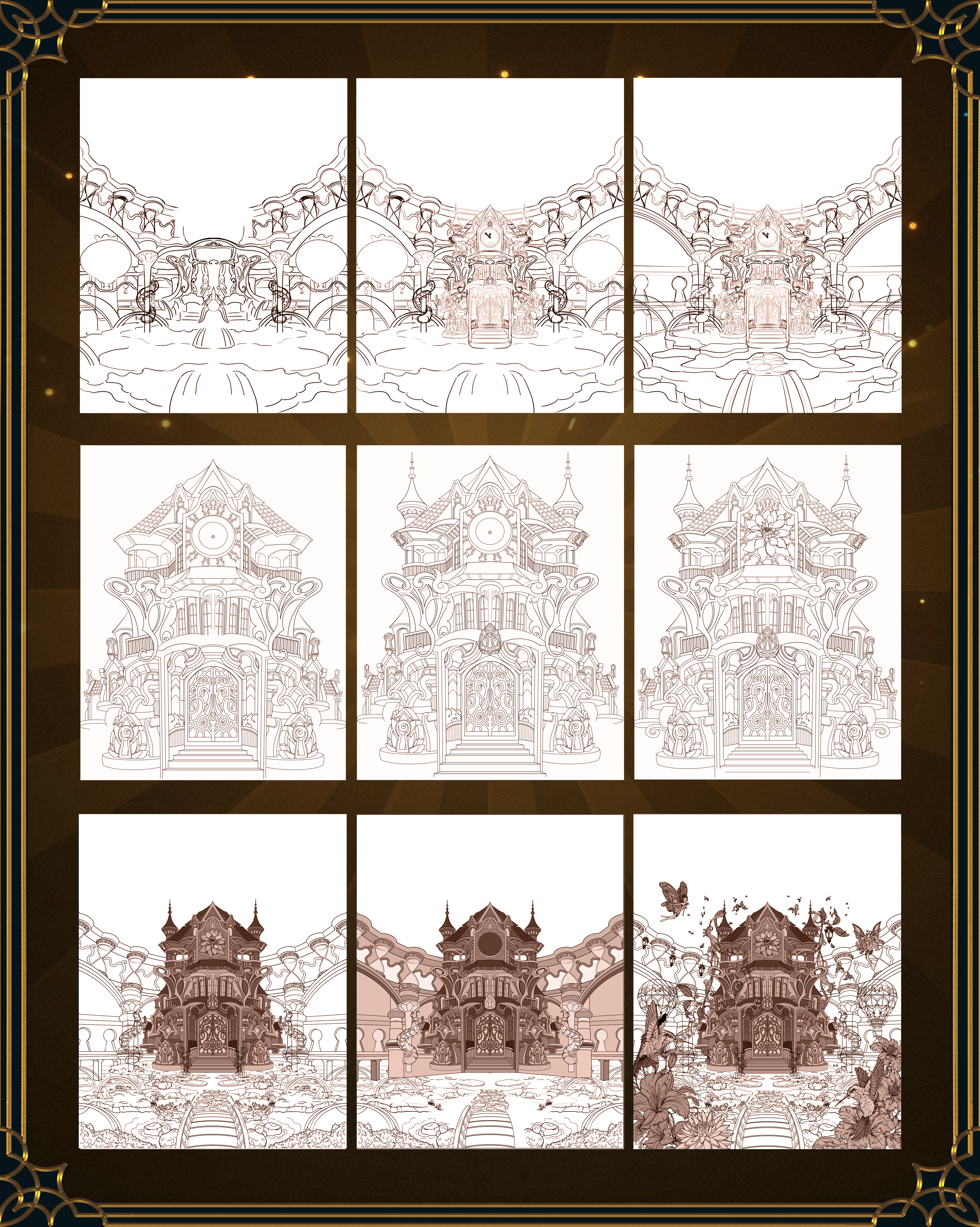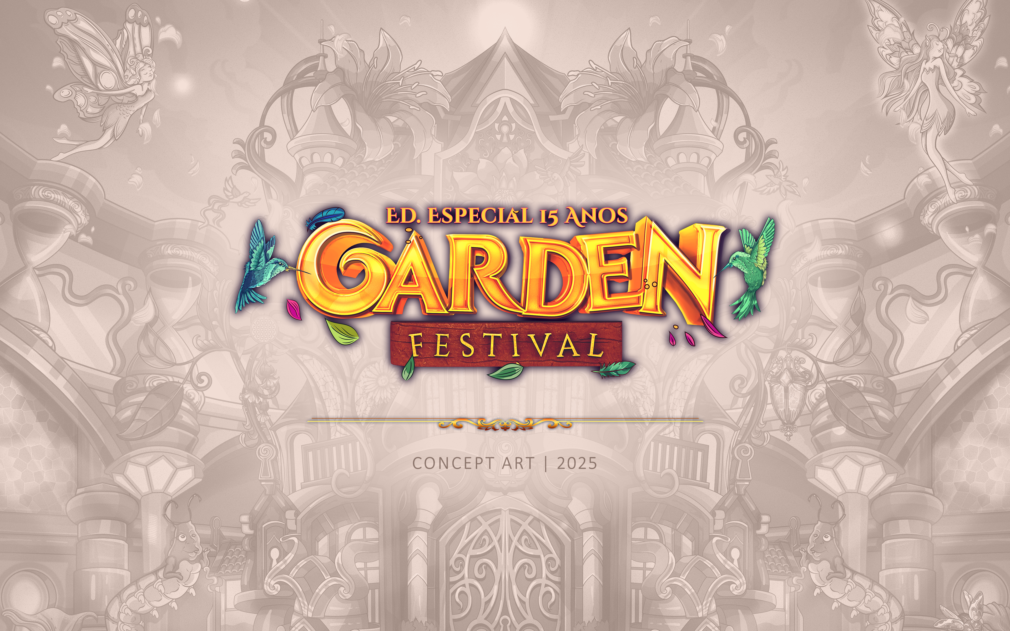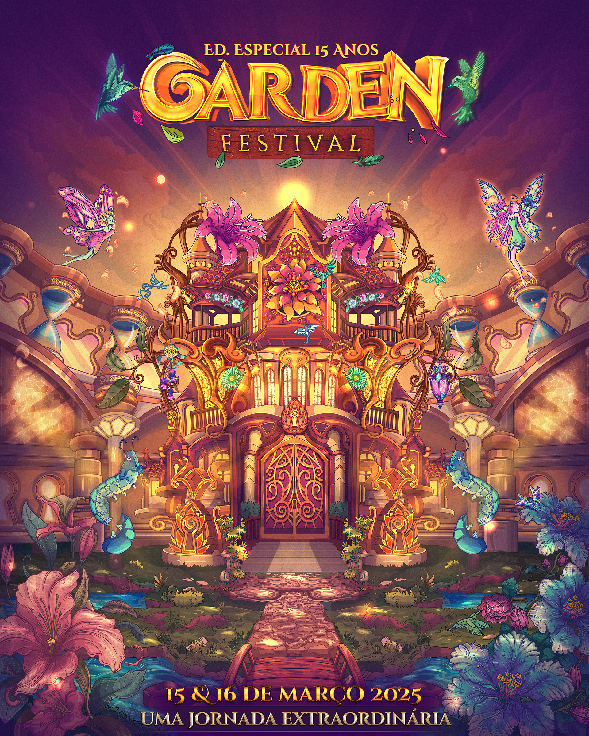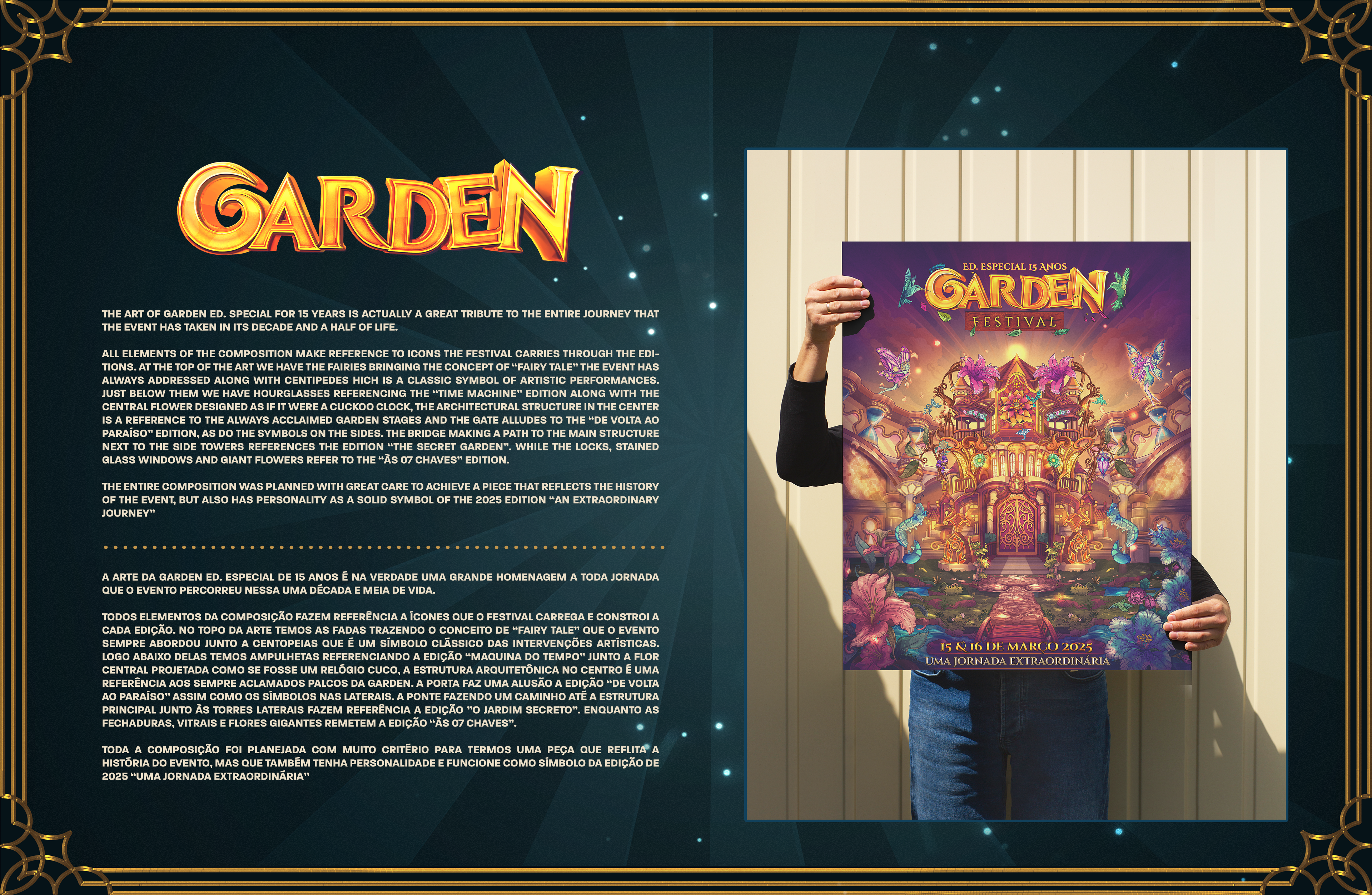 The art of Garden Ed. Special for 15 years is actually a great tribute to the entire journey that the event has taken in its decade and a half of life. All elements of the composition make reference to icons the festival carries through the editions. At the top of the art we have the fairies bringing the concept of “fairy tale” the event has always addressed along with Centipedes hich is a classic symbol of artistic performances. Just below them we have hourglasses referencing the “Time Machine” edition along with the central flower designed as if it were a cuckoo clock, the architectural structure in the center is a reference to the always acclaimed Garden stages and The gate alludes to the “De Volta ao Paraíso” edition, as do the symbols on the sides. The bridge making a path to the main structure next to the side towers references the edition “The Secret Garden”. While the locks, stained glass windows and giant flowers refer to the “Às 07 Chaves” edition.