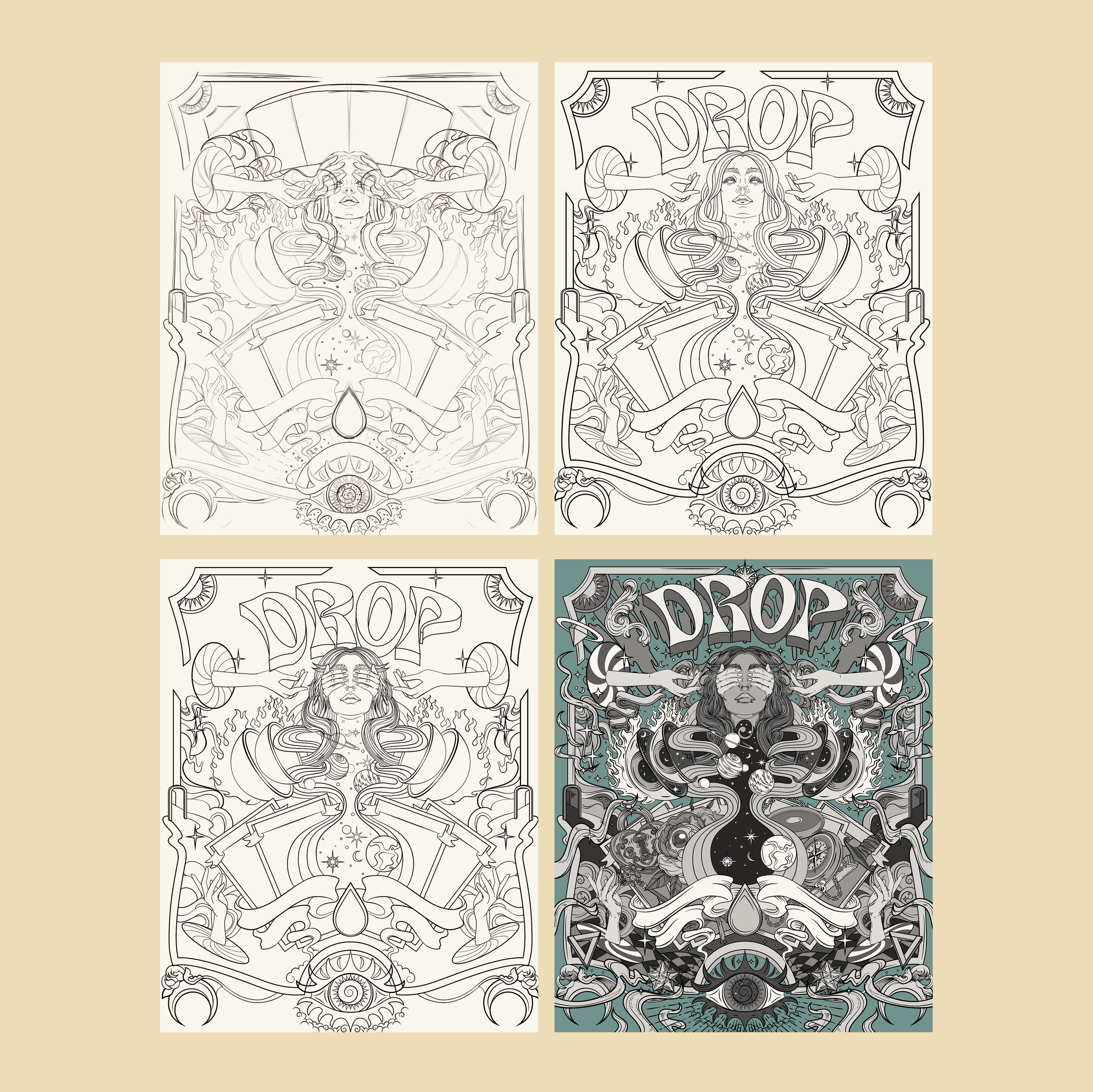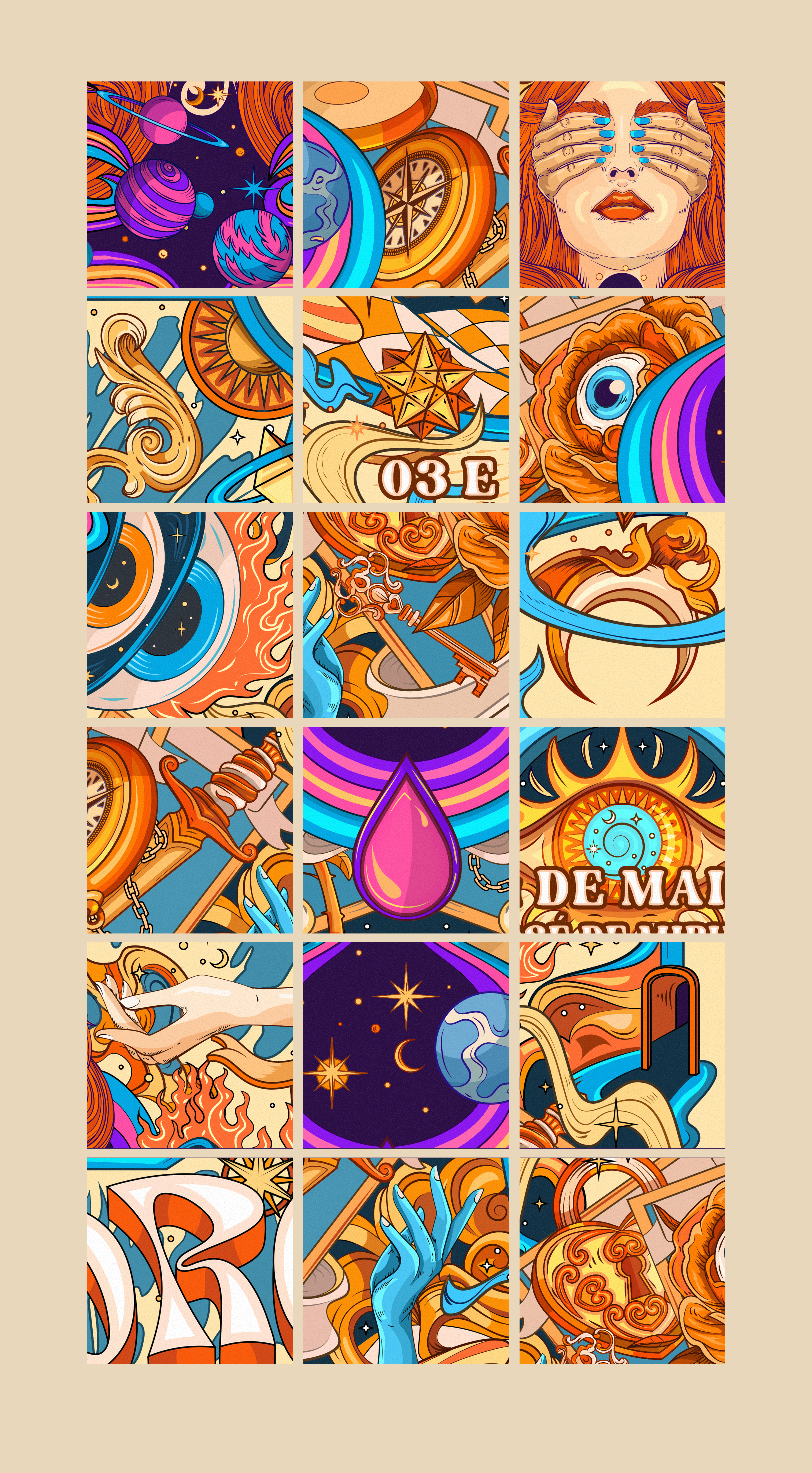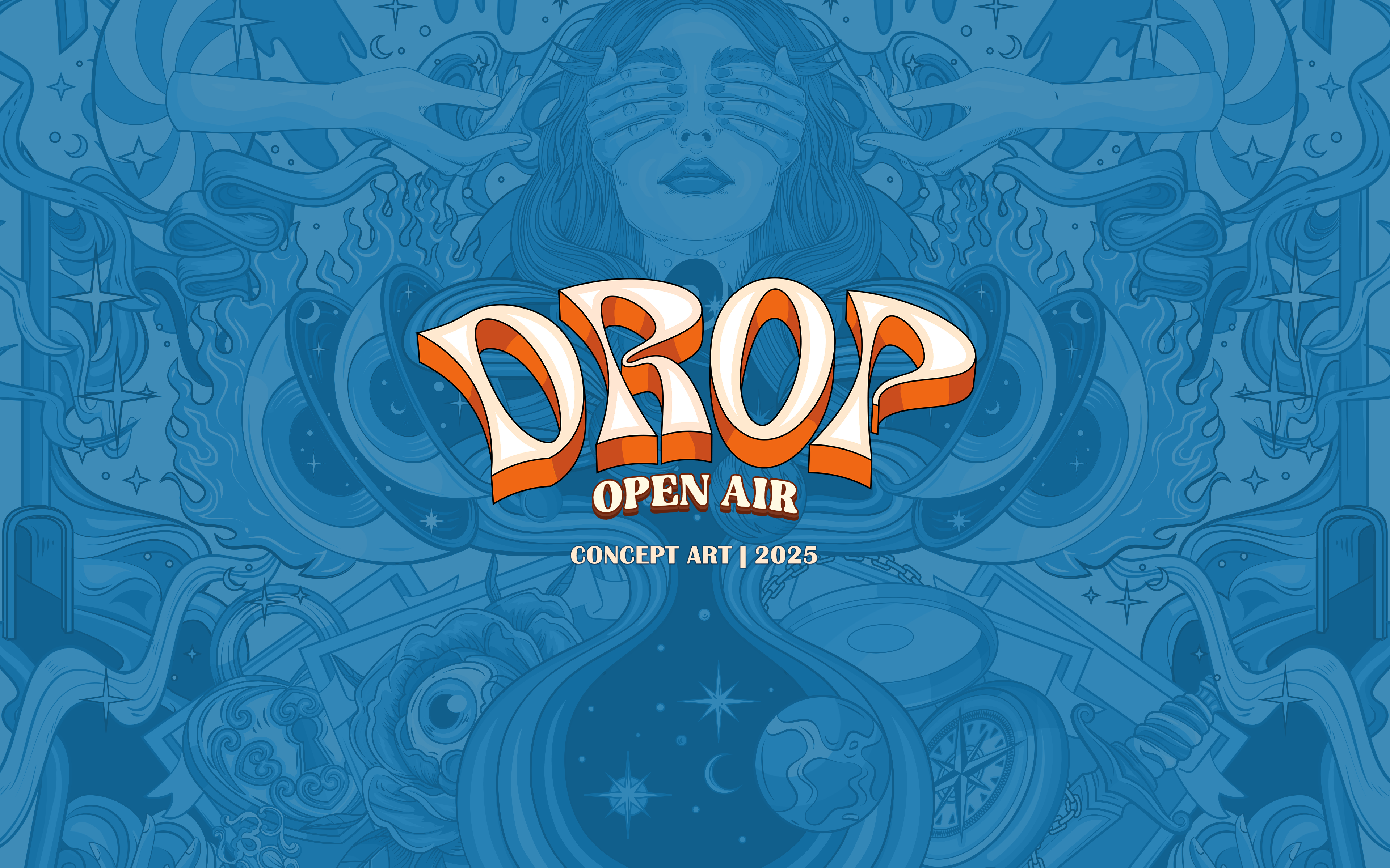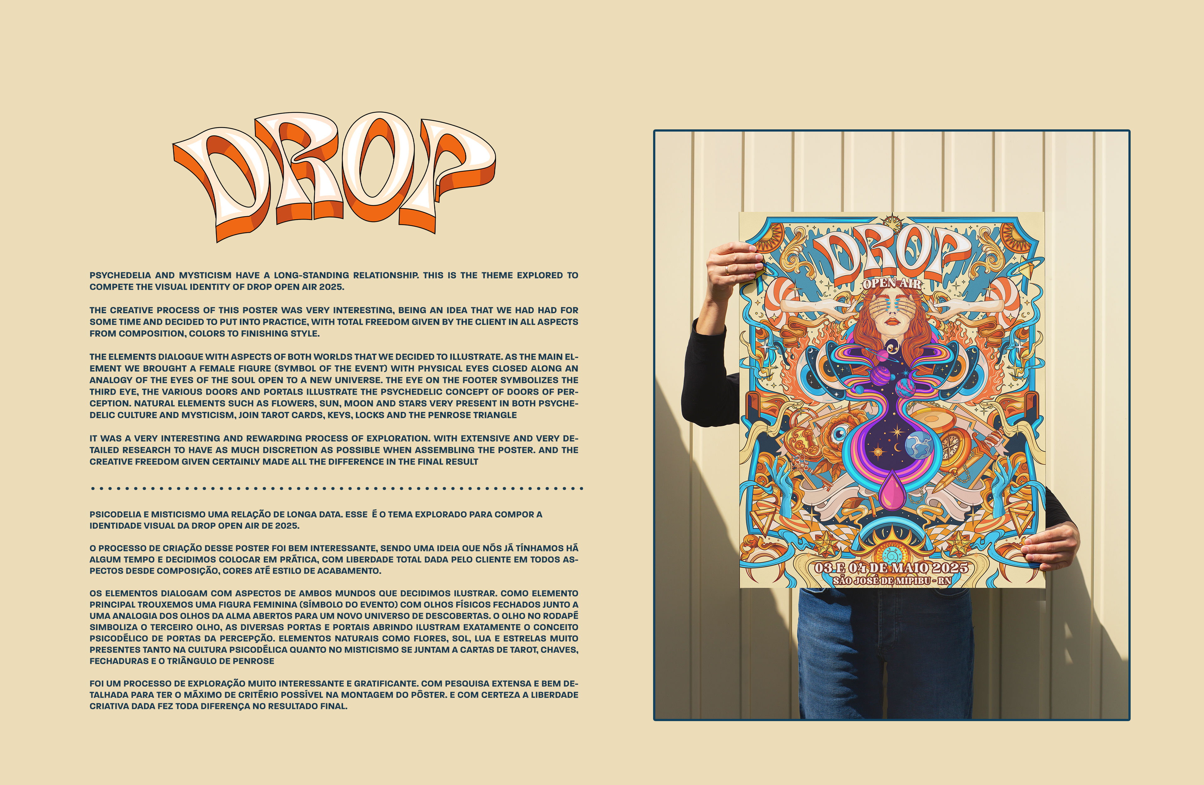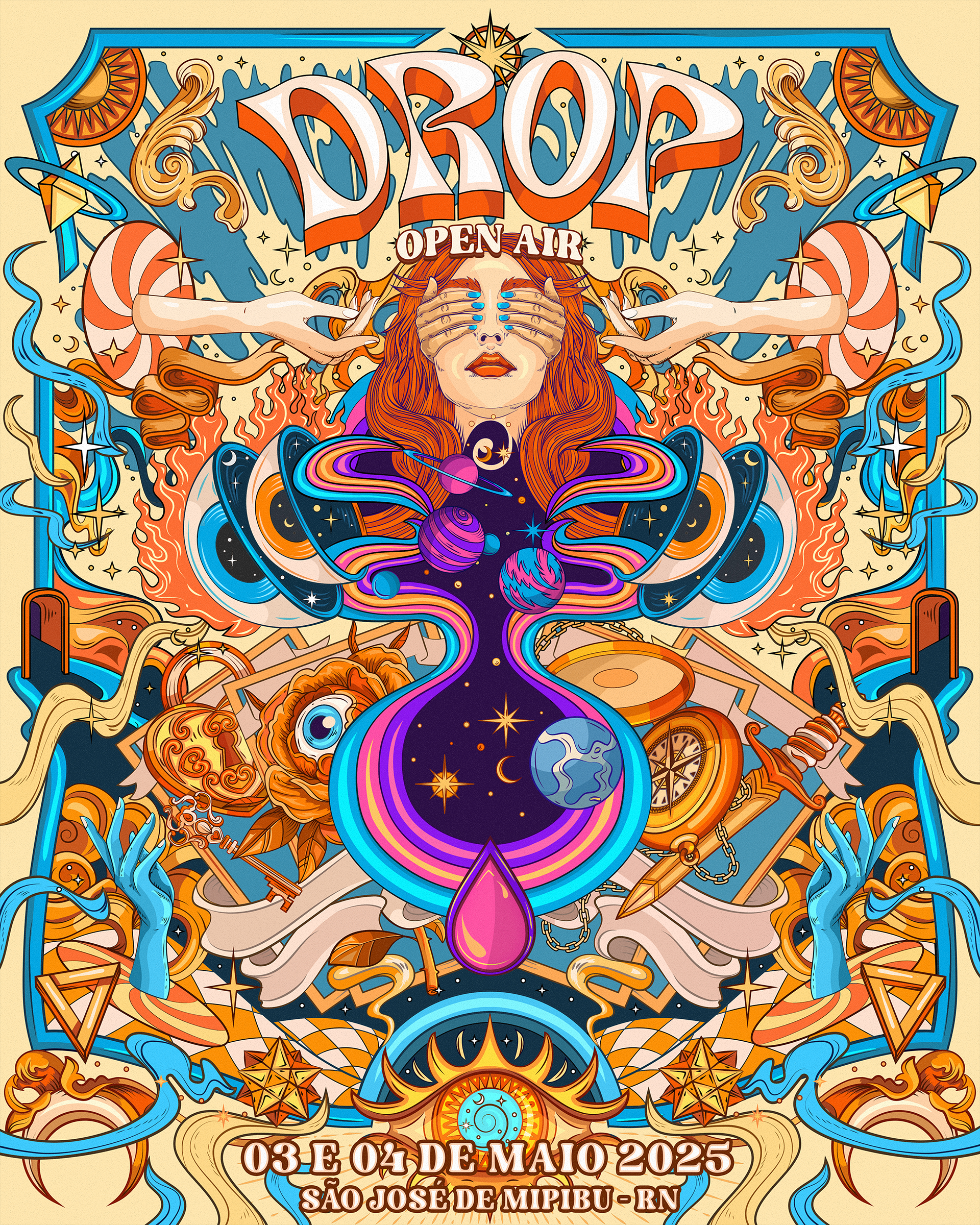 Psychedelia and mysticism have a long-standing relationship. This is the theme explored to compete the visual identity of drop open air 2025. The creative process of this poster was very interesting, being an idea that we had had for some time and decided to put into practice, with total freedom given by the client in all aspects from composition, colors to finishing style. The elements dialogue with aspects of both worlds that we decided to illustrate. As the main element we brought a female figure (symbol of the event) with physical eyes closed along an analogy of the eyes of the soul open to a new universe. The eye on the footer symbolizes the third eye, the various doors and portals illustrate the psychedelic concept of doors of perception. Natural elements such as flowers, sun, moon and stars very present in both psychedelic culture and mysticism, join tarot cards, keys, locks and the penrose triangle It was a very interesting and rewarding process of exploration. With extensi