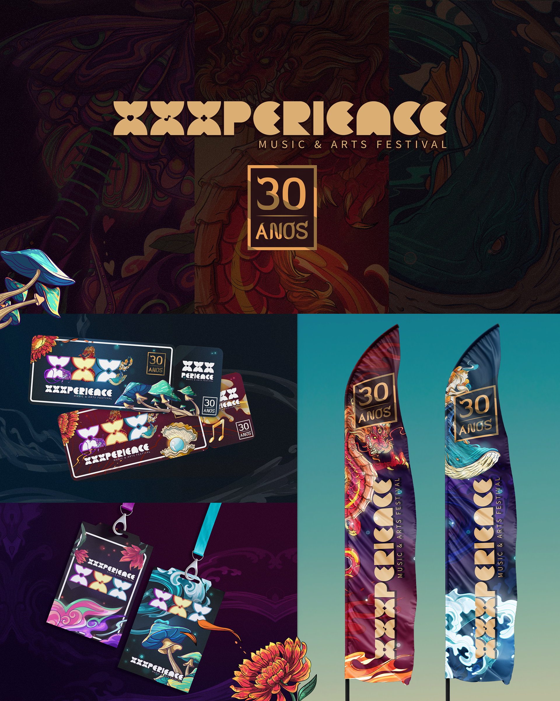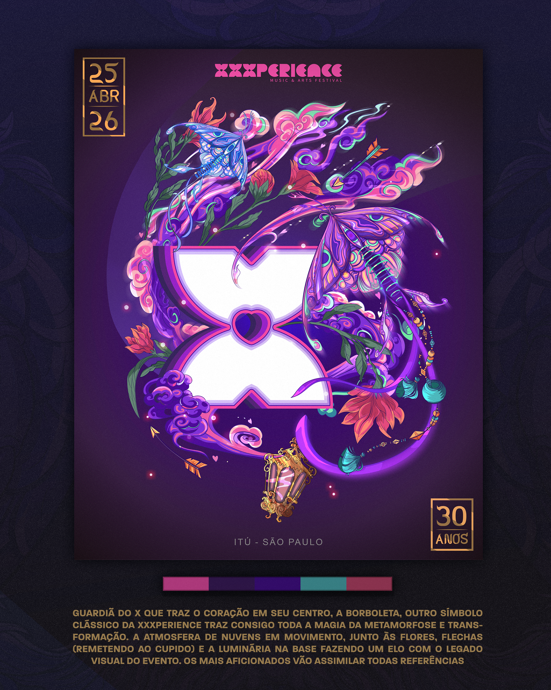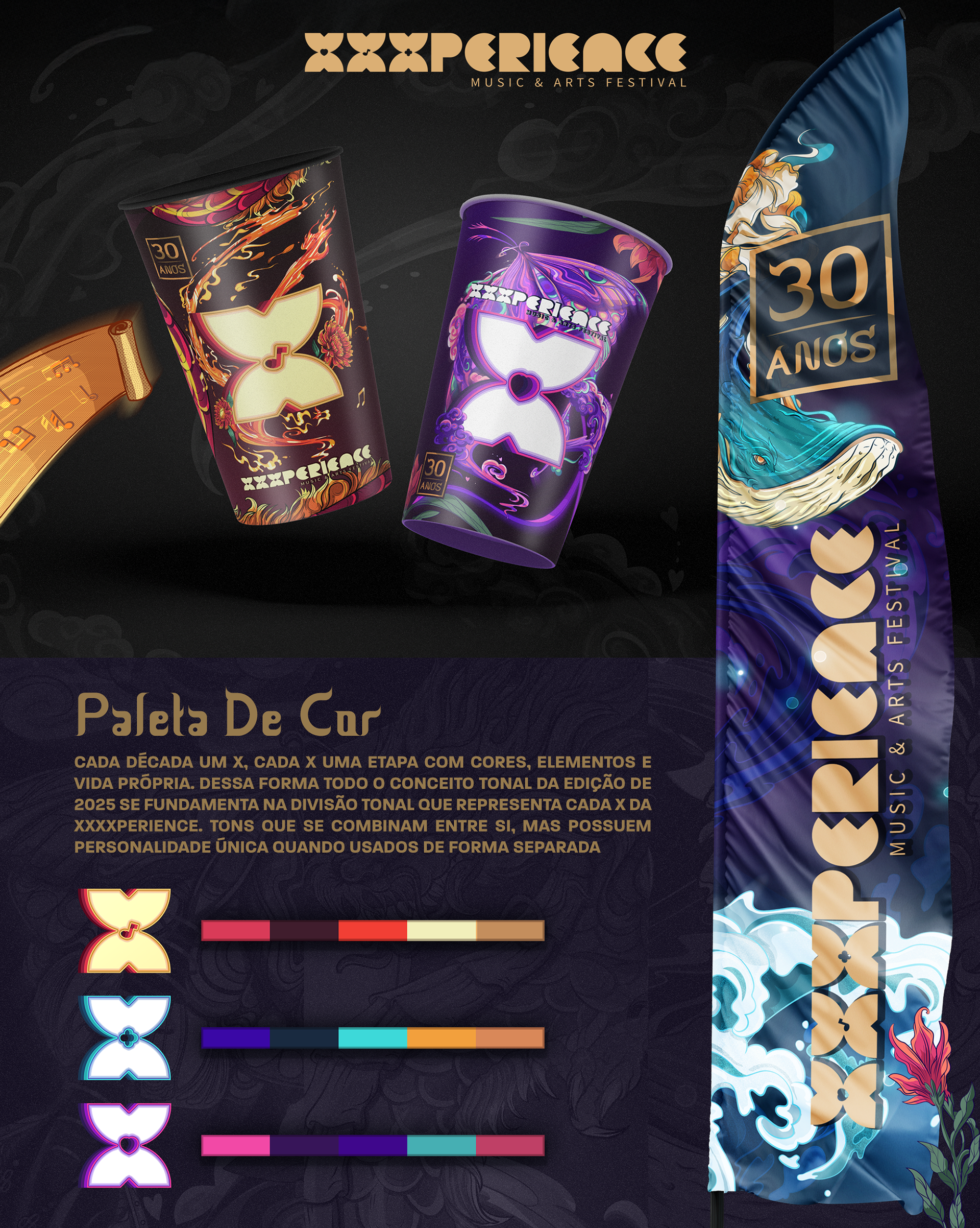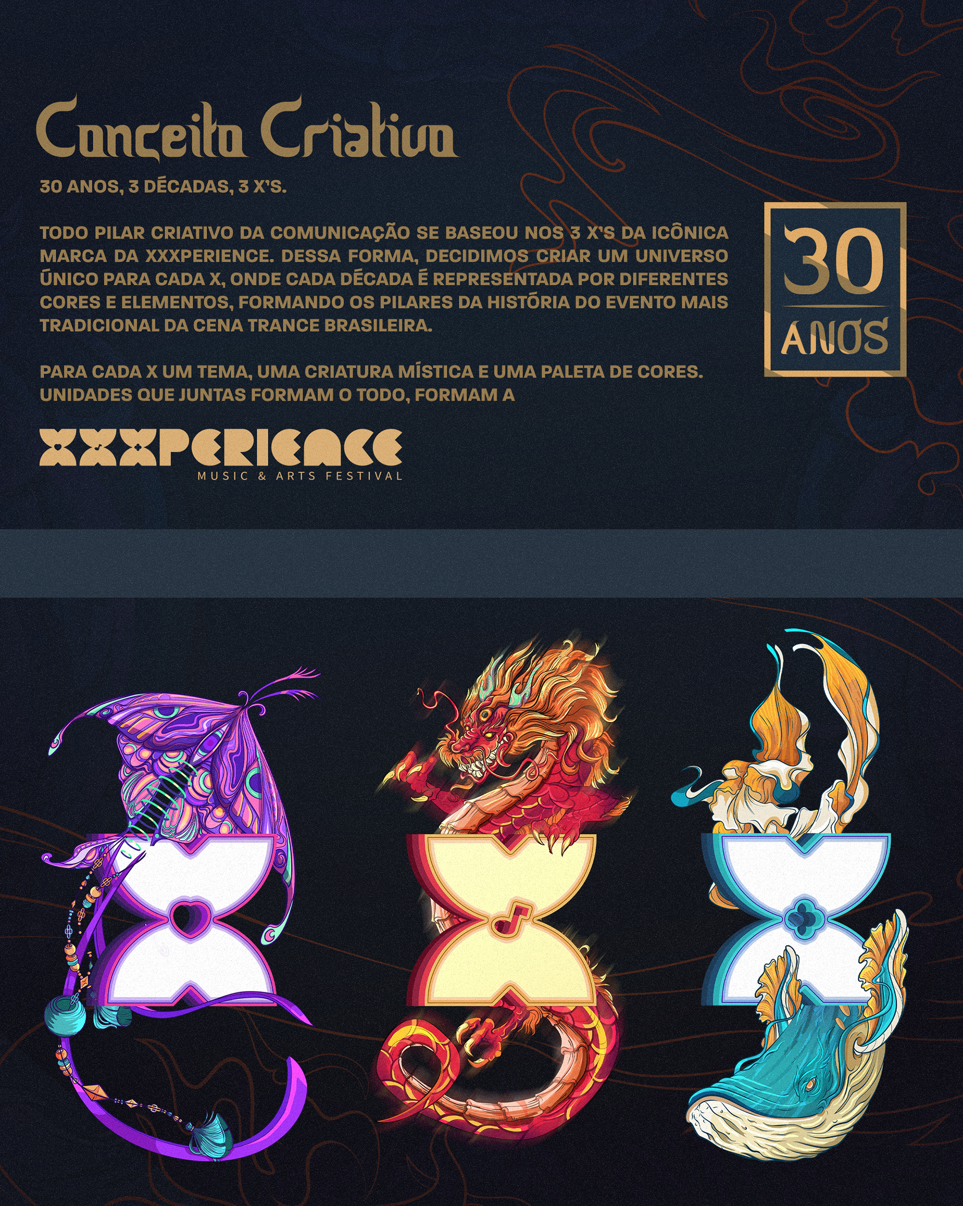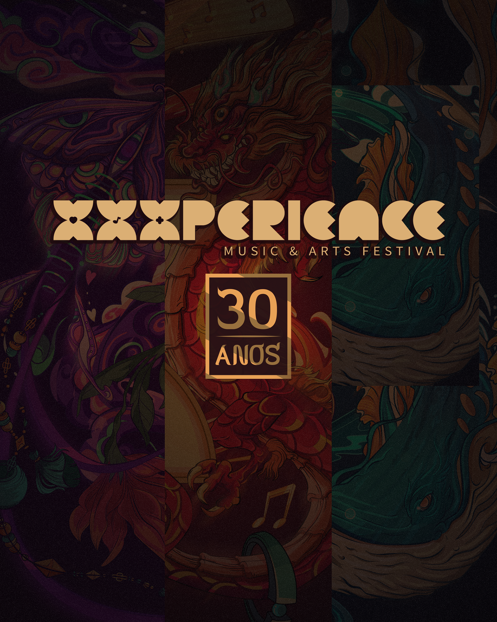 Key visual made to XXXperience 30 years event in Brasil. The main ideia was to depict one artwork to each decade of the event. So each X means a decade with your own personality, colors and elements. And to reunite the whole XXXperience world, we made the main illustration merging the elements of all decades in one single artwork.